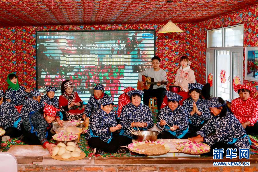 在黑龙江省双鸭山市饶河县西林子乡小南河村,村民们盘坐在土炕上展示包饺子、蒸馒头等东北民俗(2020年12月31日摄)。新华社发(徐义摄)