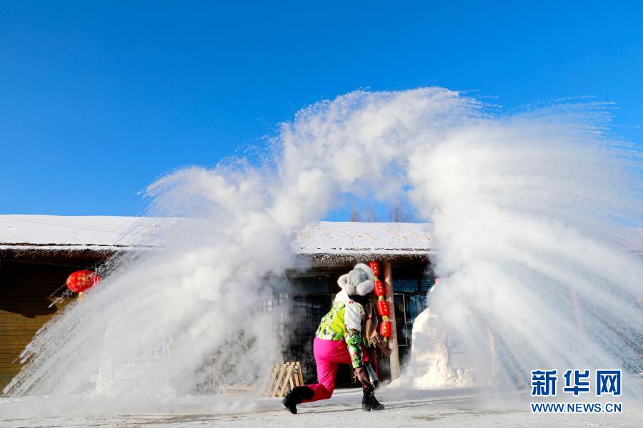 在黑龙江省双鸭山市饶河县西林子乡小南河村,游客薛福香在游客服务中心门前体验泼水成冰(2020年12月31日摄)。新华社发(徐义摄)