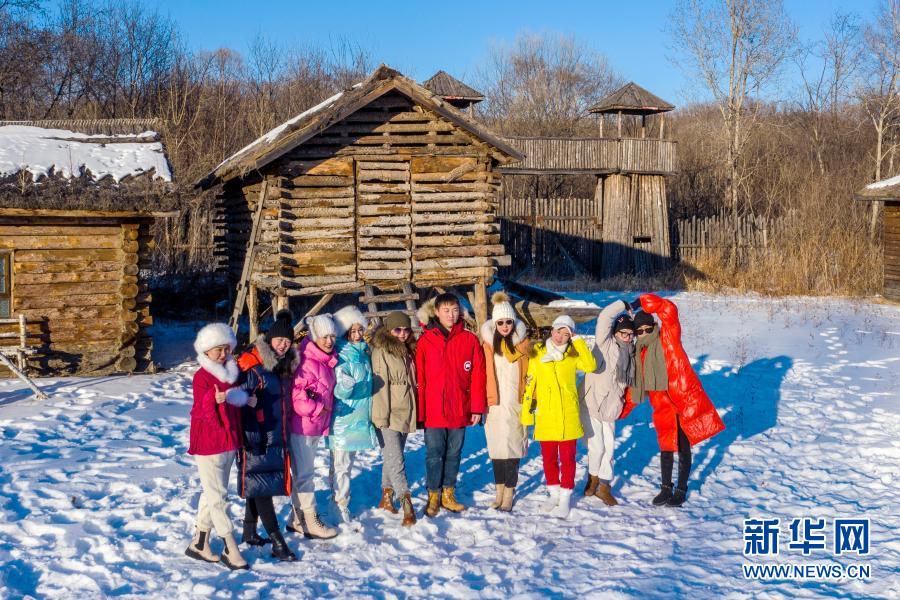 在黑龙江省双鸭山市饶河县西林子乡小南河村,游客在黑金部落民俗景区合影(2020年12月30日摄)。新华社发(徐义摄)
