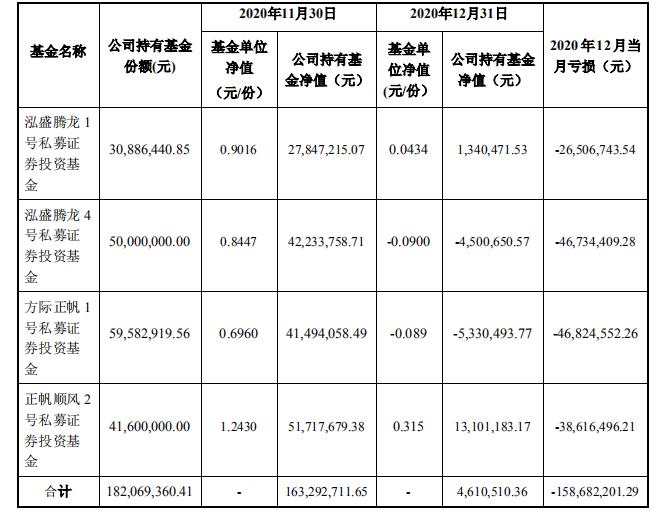 根据上述净值表,中来股份的4只基金产品于2020年12月当月亏损1.587亿元,较2020年11月亏损幅度为97.18%。