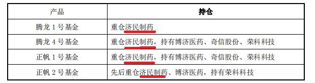 原来,在整个投资运作期间,腾龙1号基金重仓了济民制药(603222.SH);腾龙4号基金重仓了济民制药,持有博济医药(300404.SZ)、奇信股份(002781.SZ)和荣科科技(300290.SZ);正帆1号基金重仓了济民制药,持有博济医药、奇信股份和荣科科技;正帆2号基金先后重仓了济民制药、博济医药,持有荣科科技。