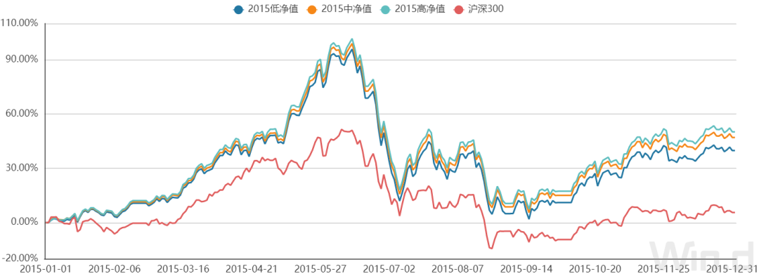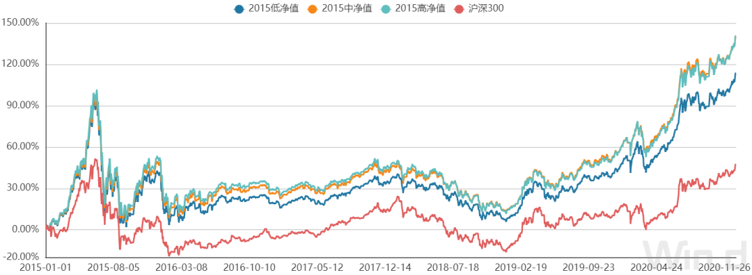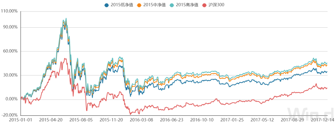 数据来源:Wind组合管理,组合中基金为根据Wind资讯“基金数据浏览器-基金市场-Wind开放式基金分类-偏股混合型基金”模块所纳入样本进行模拟测算,选取标准为2014年12月31日前成立的基金,根据2014年12月31日当天净值进行分组,分为“单位净值<1”2015低净值组,“1≤单位净值<1.5”2015中净值组和“单位净值≥1.5”2015高净值组三组,分别含97只、231只和107只基金,上述模拟样本及方法具有一定局限性,仅说明过往情况,不构成任何投资建议。