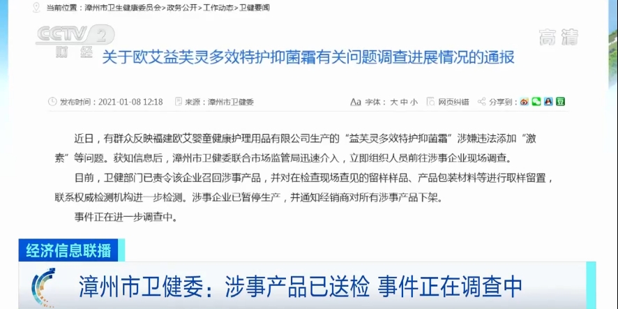9日下午,漳州市卫建委工作人员回复总台央视记者,目前涉事产品已送检。有进一步信息,将第一时间发布。
