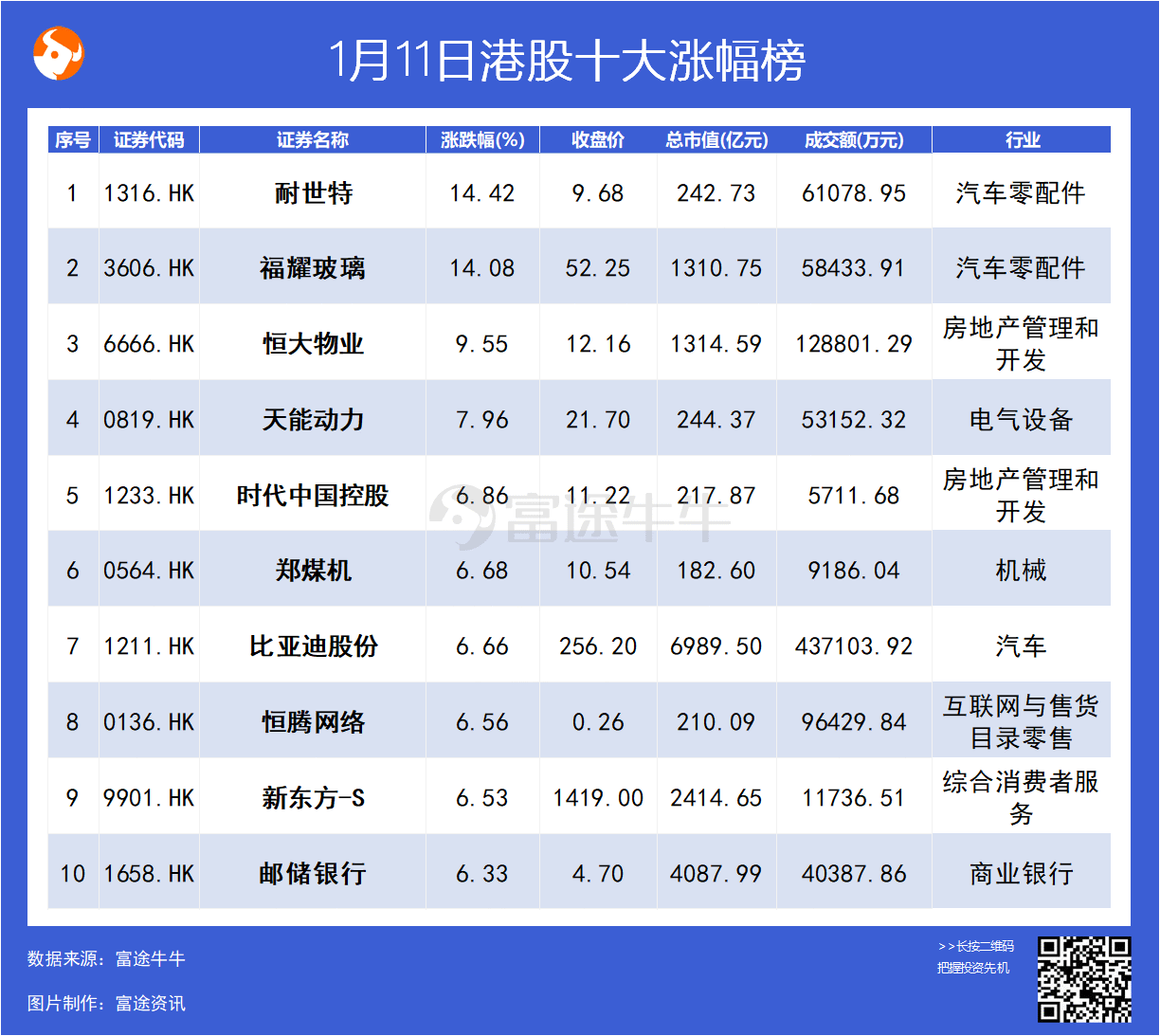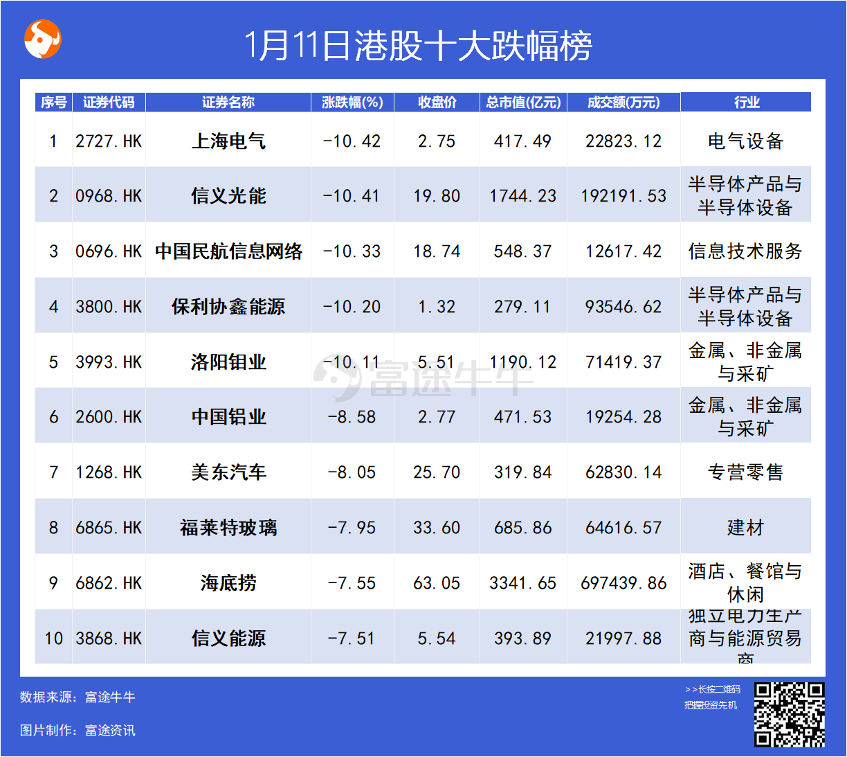 上图分别为今日收盘涨、跌幅最大的10支港股,已剔除总市值小于100亿港元和成交额小于1000万港元的股票。