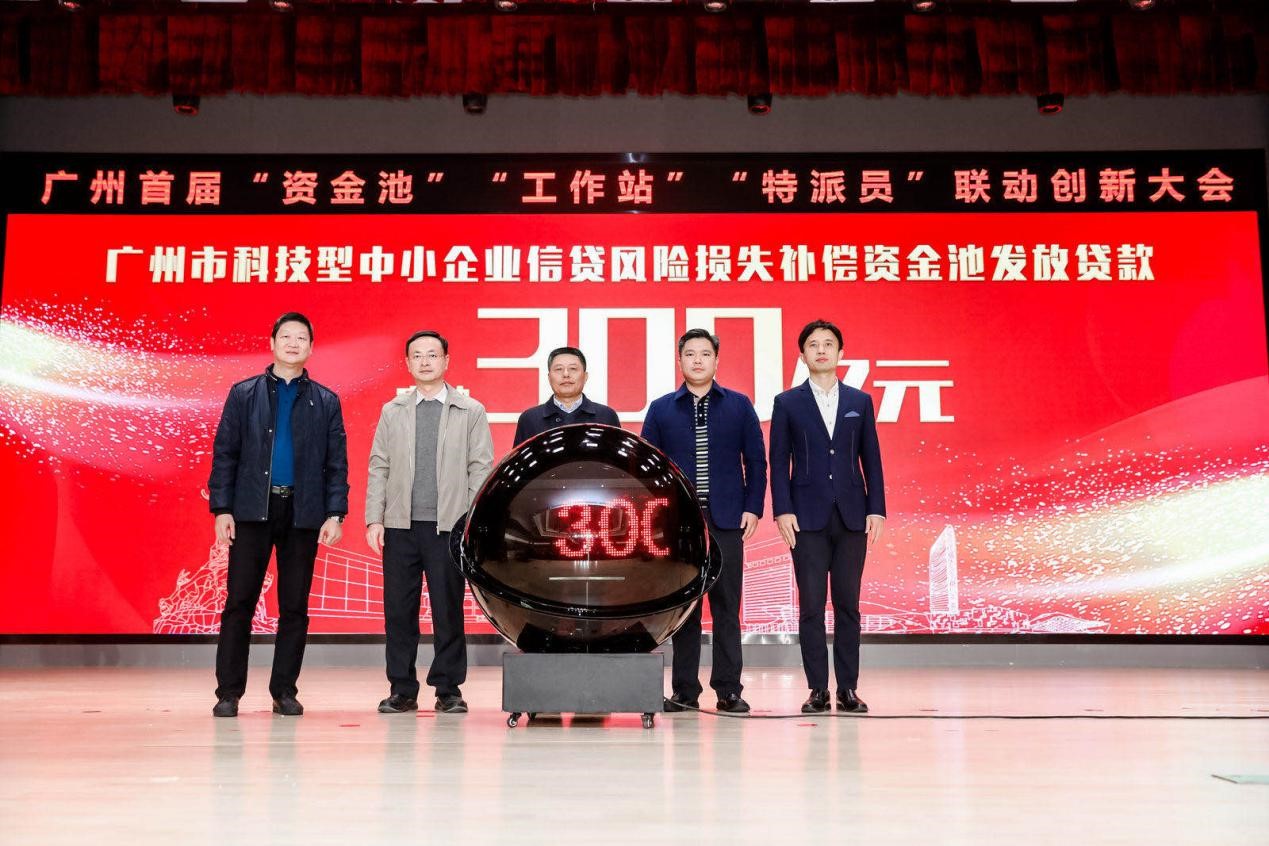 广州市科技局副巡视员石鹏飞、科技金融处处长钟伟彬、平台处处长潘海潮,广州市科技金融综合服务中心董事长兼总经理吴俭峰,大湾区科技创新服务中心董事长兼总经理秦海鸥共同见证广州市科技型中小企业信贷风险损失补偿资金池累计放贷突破300亿元。