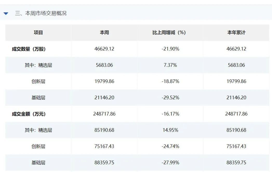 新三板挂牌公司成交总数额为46629.12万股,同比下降21.90%;成交额为24.87亿元,同比下降16.17%。其中,精选层成交数额为12181.00万股,同比增长7.37%,成交金额为8.52亿元,同比增长14.95%。