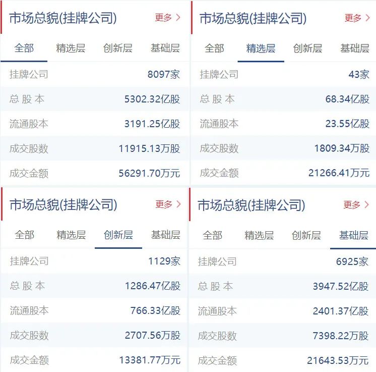 新三板挂牌公司总计8097家(精选层43家,创新层1129家,基础层6925家),总股本5302.32亿股,流通股本3191.25亿股。