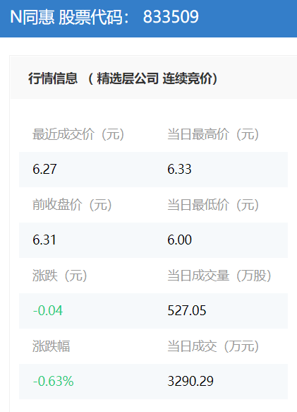 从今日盘面上看,同惠电子以6.25元/股的价格开盘,开盘即破发;报收6.27元/股;换手率为16.45%;盘中最高股价为6.33元/股,最低股价为6.00元/股;当日成交额达3290.29万元;当日跌幅为0.63%。