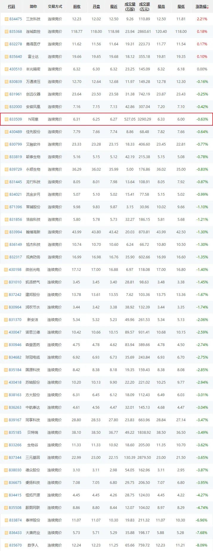 1月11日,精选层43家企业中,仅4家上涨,1家平盘,其余38家均呈下跌。其中,三友科技(834475)上涨2.21%,涨幅居首;其次,连城数控(835368)上涨0.18%;数字人(835670)跌幅居首,下跌8.09%;大唐药业(836433)下跌7.68%居次;丰光精密(430510)平盘。同惠电子(833509)今日挂牌首日,下跌0.63%。