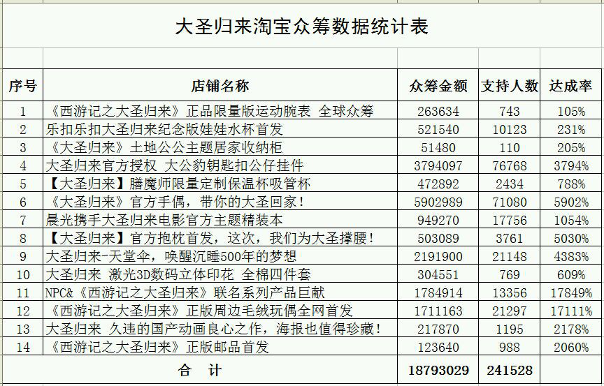 2015年《大圣归来》的衍生品运营方“娱猫”和天猫联合进行了《大圣归来》“梦工厂”周边众筹行动,当日销售额突破1180万,其中达成额度最高的品类是官方手偶,高达252万元。