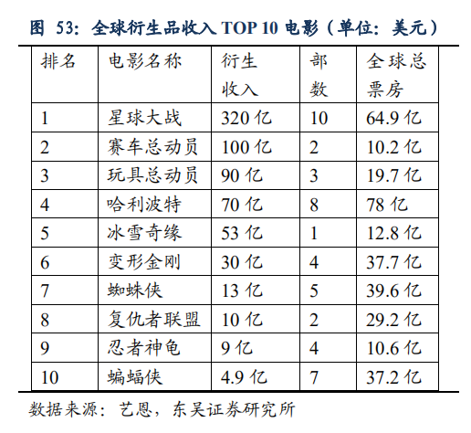 如果对标全球市场,以衍生品市场3倍于电影票房的水平进行简单测算,电影周边市场空间近百亿元。对于现阶段的电影行业而言,衍生品还有巨大的想象力。