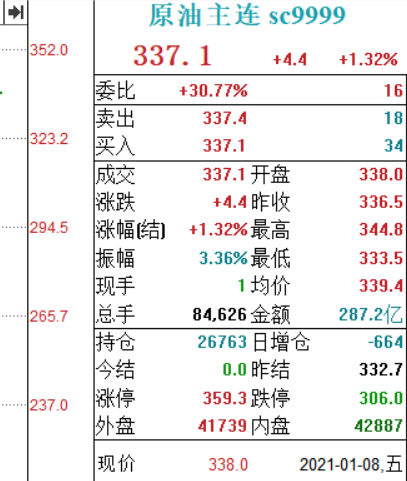 1月8日,截至15:00,原油主连上涨1.32%,交易量287.2亿,最新价格337.1。