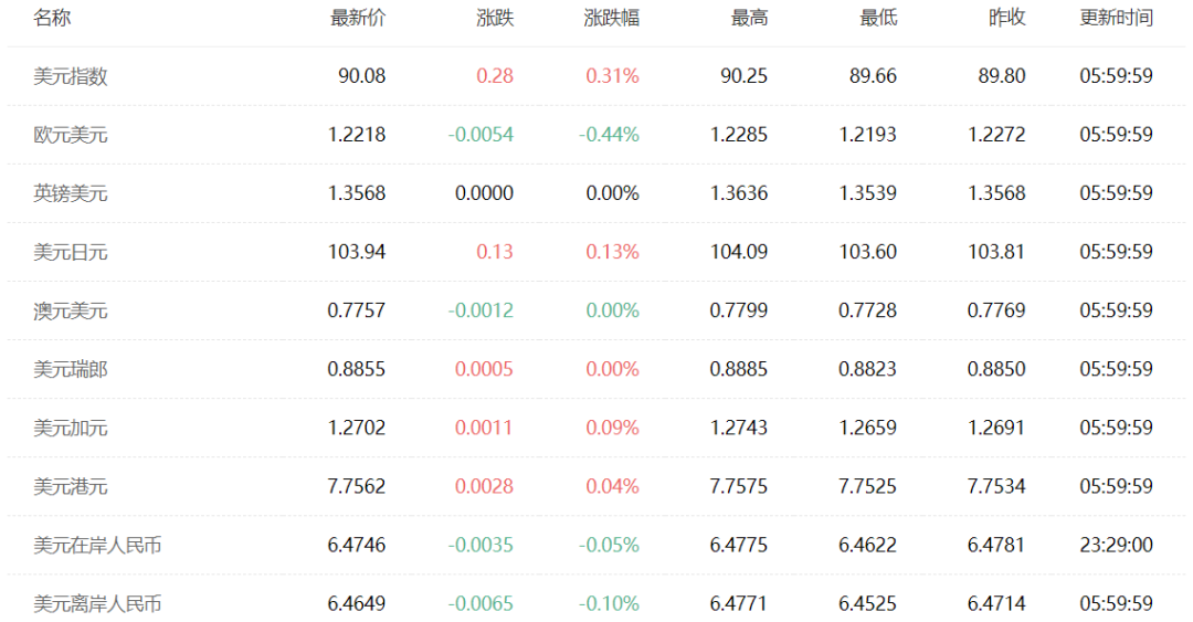 截止1月9日05:59,美元指数上涨0.31%,报90.08;欧元下跌0.44%,报1.2218;英镑涨跌0.00%,报1.3568。