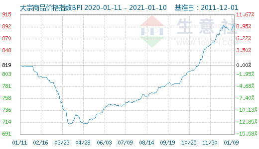 1月9日大宗商品价格指数BPI为891点, 较昨日下降了5点 , 较周期内最高点1019点(2012-04-10)下降了12.56%,较2016年02月03日最低点660点上涨了35.00%。(注:周期指2011-12-01至今)