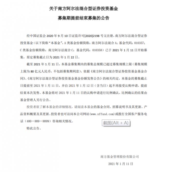 南方基金目前已经发布了提前结束募集的公告,南方阿尔法混合基金的募集截止日提前至2021年1月11日,并自2021年1月12日(含当日)起不再接受认购申请,提前结束本次发售。并将对2021年1月11日的认购申请进行比例确认,比例确认的结果由基金管理人另行公告。