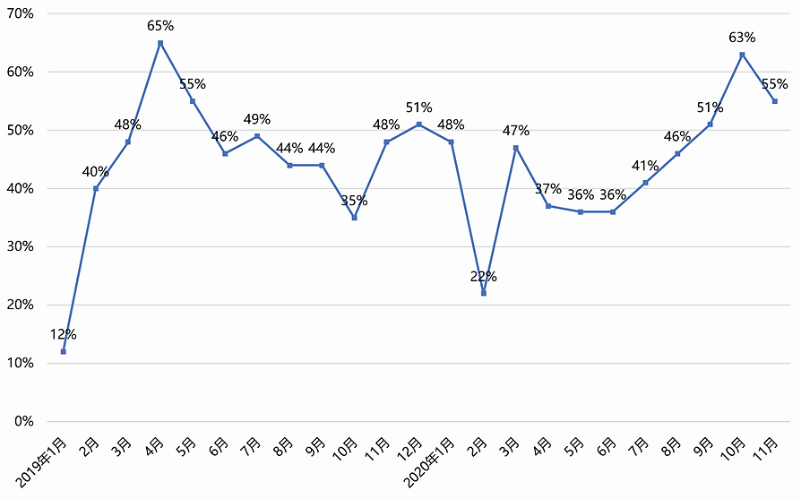 人才购房新政利好+买家需求积压+新货供应充足,促使2020年下半年成交强势走高。从3月开始,广州一手住宅成交量就呈现逐渐恢复趋势,但截至到6月才实现单月同比转正。但在市场情绪、政策利好等刺激下,下半年成交增速逐渐提高,全年走势与2019年呈现“x”型格局,整体市场“先抑后扬”。