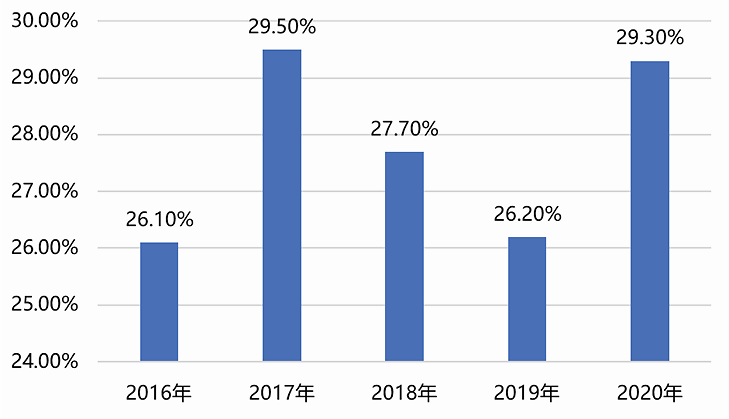 图7:2016-2020年增城成交套数占全市比例