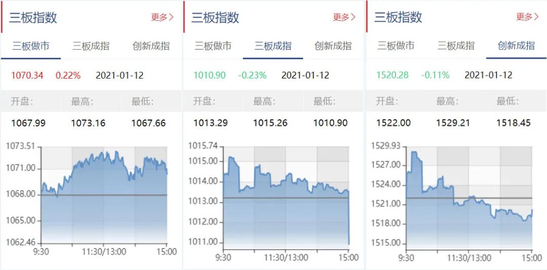 截至1月12日收盘,三板做市报1070.34点,上涨0.22%;三板成指报1010.90点,下跌0.23%;三板创新成指报1520.28点,上涨0.11%。