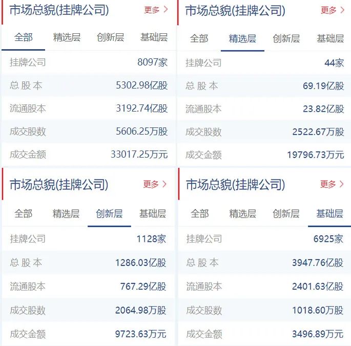 新三板挂牌公司总计8097家(精选层44家,创新层1128家,基础层6925家),总股本5302.98亿股,流通股本3192.74亿股。