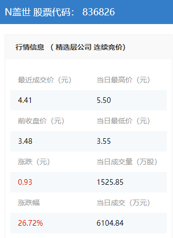 今日报收4.41元/股;换手率为56.95%;当日成交额达6104.84万元;当日涨幅为26.72%。