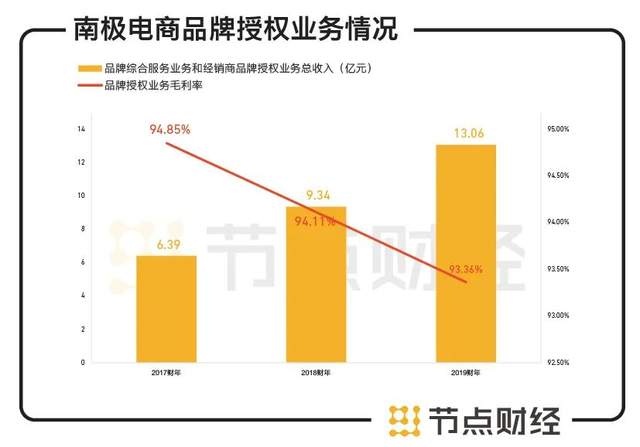 在营收和净利润快速增长的同时,南极电商的品牌综合服务业务和经销商品牌授权业务收入也在逐年增加。财报显示,2015年至2019年,南极电商的上述两项品类的收入总和分别为2.74亿元、4.66亿元、6.39亿元、9.34亿元和13.06亿元。2019年,其品牌授权业务的净利润超过10亿元。