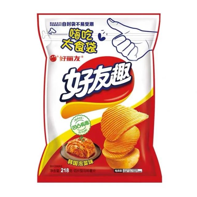 酸菜,也是一种泡菜。随着韩国文化的强势输出,韩国饮食也顺势走出。好丽友顺势推出泡菜味薯片,薯片的口感、泡菜的口味都让这款产品受到年轻人的喜爱,在中国市场也是饱受好评的薯片产品。