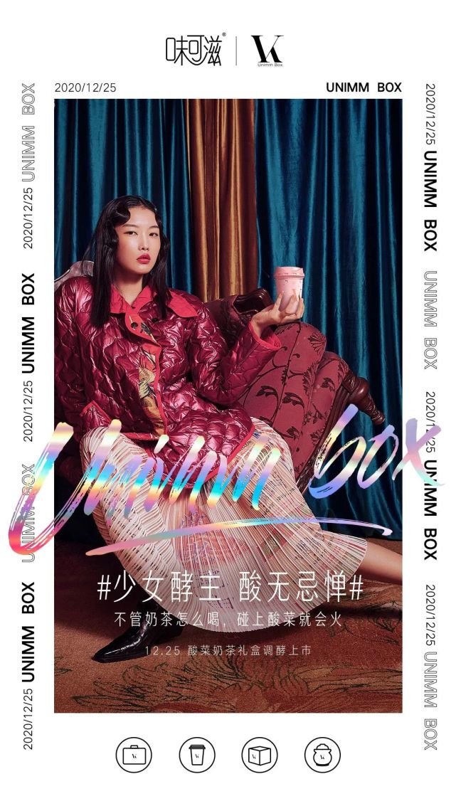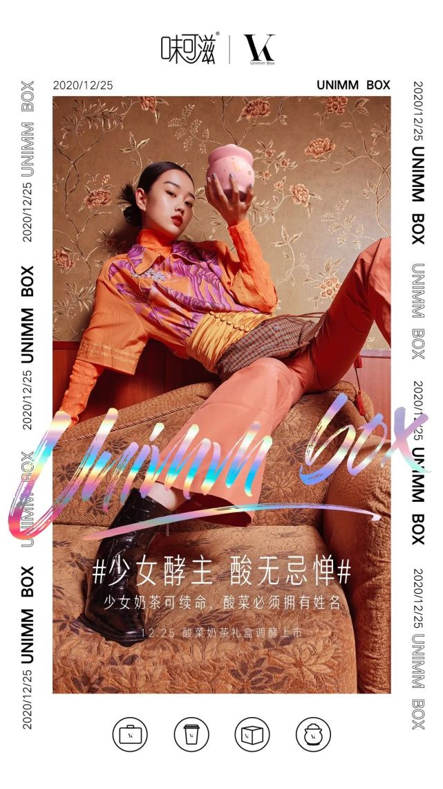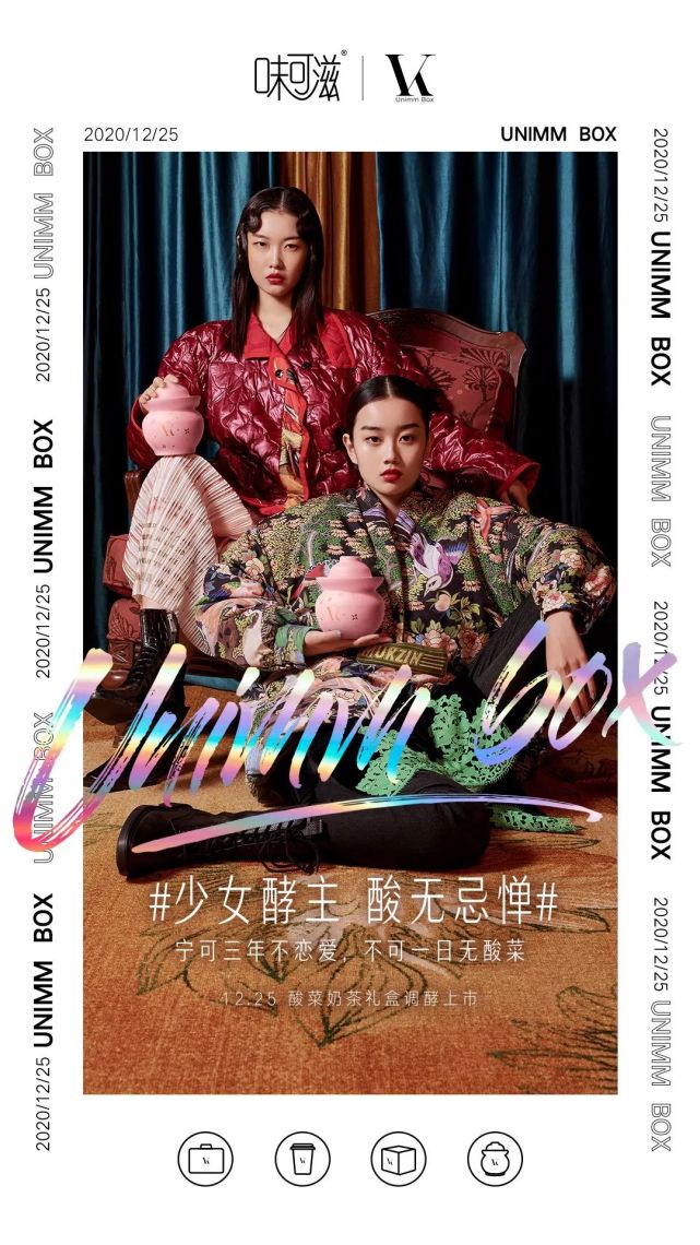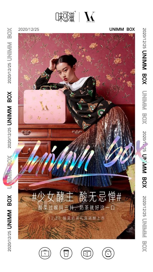 为了明晰新品奶茶定位,味可滋首次推出旗下高端奢侈品牌“VK”,并将酸菜奶茶礼盒包装成极具奢侈感的单品礼盒,并提出“少女酵主,酸无忌惮”的slogan。