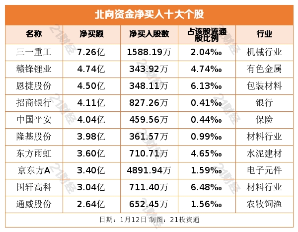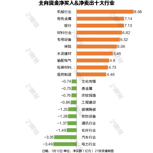 据21投资通(微信号ID:touzit21)智能监测,1月12日,北向资金净买入84.45亿元,其中沪股通净买入39.87亿元,深股通净买入44.58亿元。