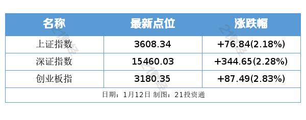 1月12日,三大股指均涨超2%,沪指站上3600点,钛白粉、白酒、船舶制造等板块领涨。