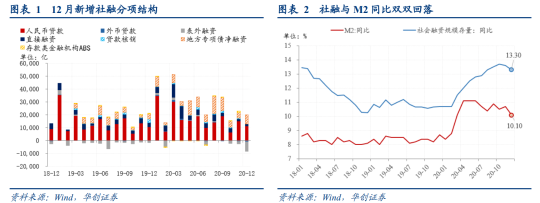 2020年12月新增社融1.72万亿(前值2.13万亿),新增人民币贷款1.26万亿元(前值1.43万亿),社融存量同比增长13.3%(前值13.6%),M2同比增长10.1%(前值10.7%),M1同比增长8.6%(前值10%)。