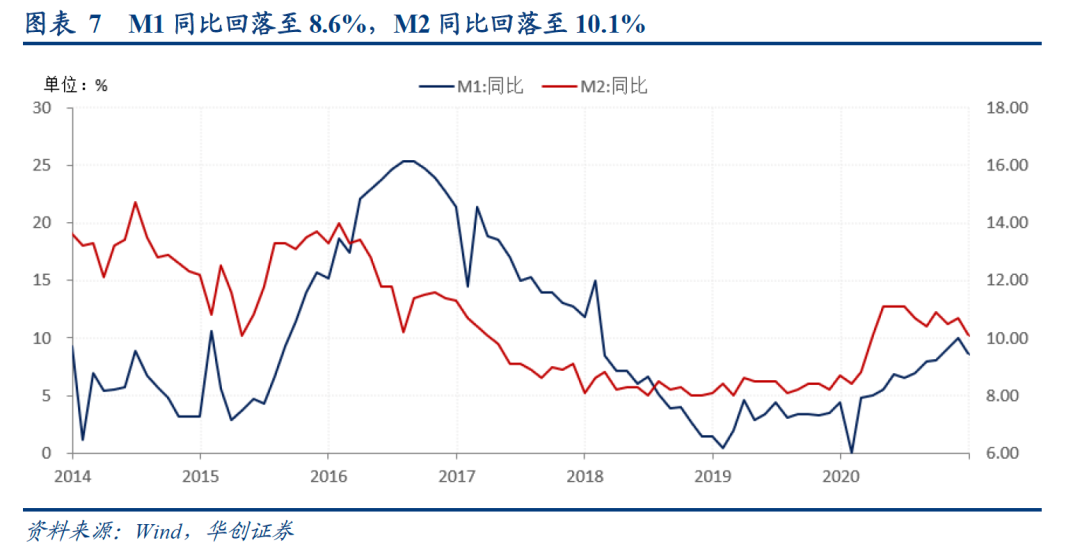 12月M2同比回落至10.1%,M1同比下行至8.6%。从新增规模来看,M2新增约1.5万亿,同比少增约1万亿,M1新增约7000亿,同比少增约6550亿。M1缘和快速回落,一则是本身翘尾因素调低了2.4个百分点,二则是超季节性的少增,从我们的M1三因子模型来看,这与12月信托融资“赶作业”集中收缩规模,以及城投债融资回落有关。