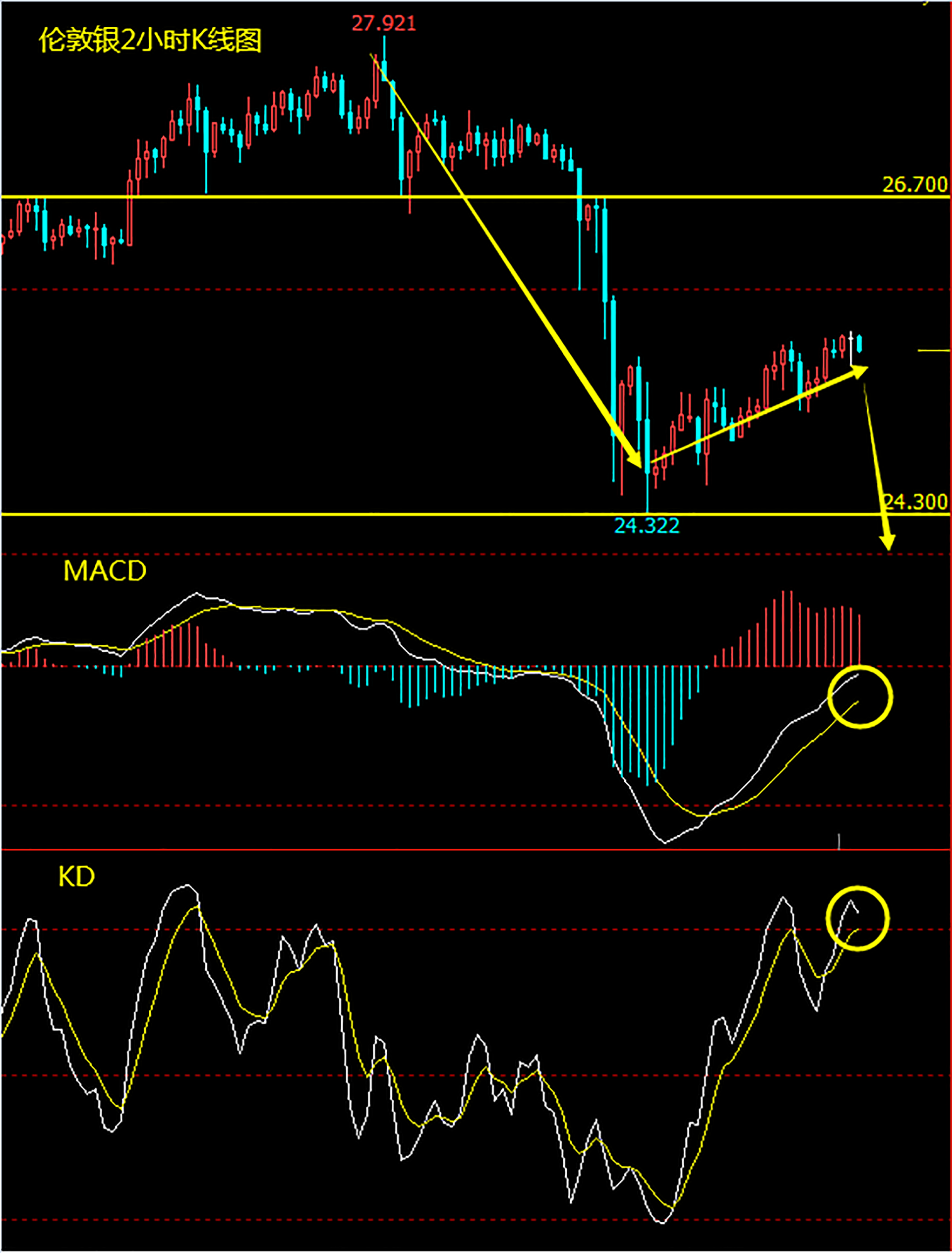 伦敦银2小时K线周期为“下行---整理---下行”的形态走势。MACD指标位于零轴下方且将形成死叉、KD指标位于高位且将形成死叉,预示后市【点击查看】