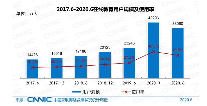 2020年,在疫情的极速催化下,在线教育迎来了前所未有的发展高潮,CNNIC发布的第46次统计报告显示,截至2020年6月,我国在线教育用户规模达3.81亿,占网民整体的40.5%。随着疫情防控进入常态化阶段,大中小学逐步有序开学复课,在线教育用户规模相比第一季度有所回落,但仍处于较高水平。