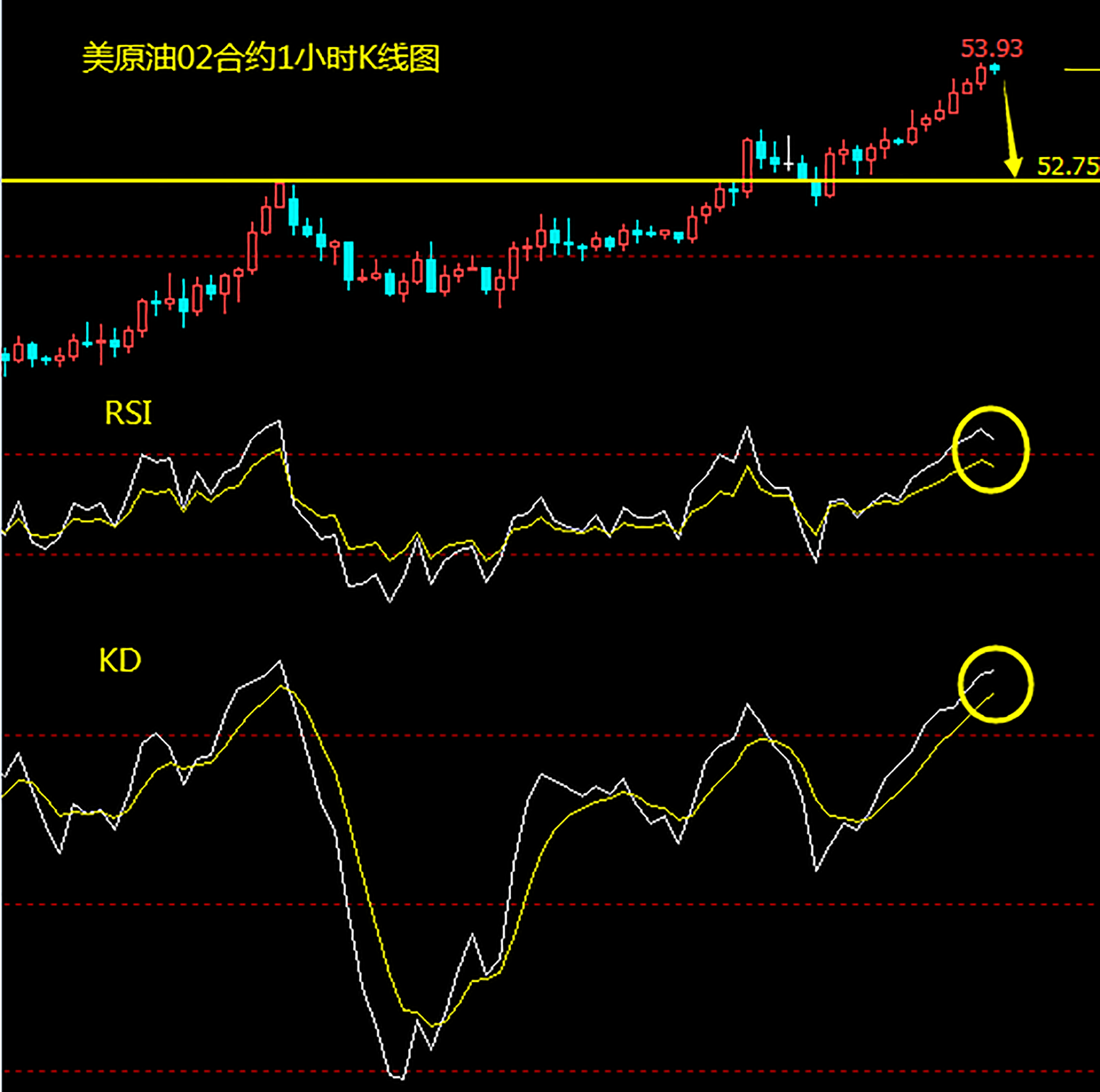 美油1小时K线周期为“冲高回落”走势。短期的支撑位位于52.75一线(底部形态的颈线位置)。RSI指标到达超买区域、KD指标位于【点击查看】