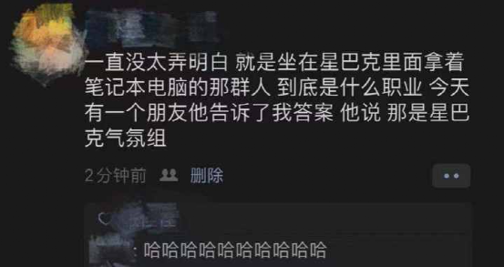 星巴克氛围组营销最初来源于一张网络图,有人在网上好奇,那些成天坐在星巴克拿电脑的人到底是谁?结果有人说那是“星巴克氛围组”。
