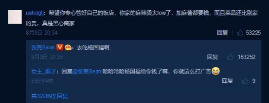 去年8月,有网友在明星张亮微博下吐槽“张亮麻辣烫”存在麻酱乱收费等问题,结果此“张亮”非开创麻辣烫品牌的“张亮”,因此明星张亮回复了一句“去吃杨国福啊……”