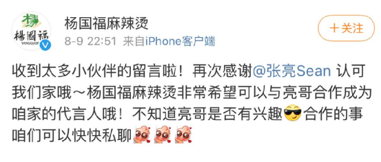 新梗由此诞生,明星张亮的回复受到了网友们的关注,但杨国福麻辣烫更是趁热打铁接下网络梗,向明星张亮发起代言人的邀约,引爆了社交话题。
