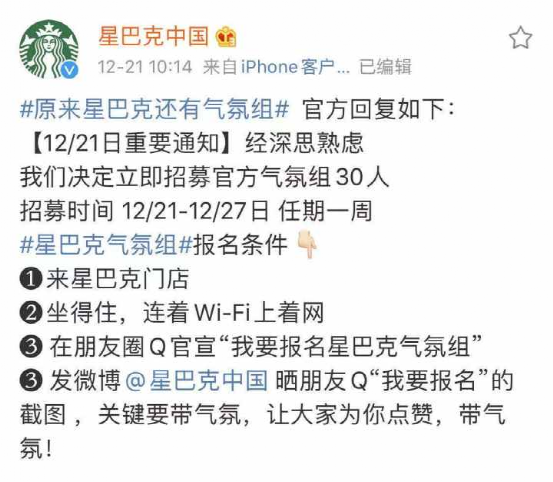但没想到的是星巴克官方开始接梗了,官微公开在网上招聘“星巴克氛围组”,从而引起了另一波舆论狂欢,形成更大层面的破圈传播效应。