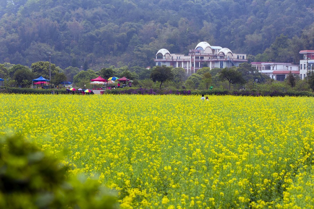 春天的“广州最美乡村”红山村,被延绵的油菜花包围,恍如一片金色海洋,颜值丝毫不输婺源。