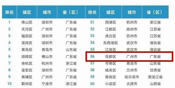 2020年9月10日,由赛迪顾问城市经济研究中心编制的《2020年中国城区高质量发展白皮书》在京发布。白皮书显示,中国百强区仅用全国0.6%的国土面积和7.6%的人口,创造了全国16.8%的生产总值,经济资源在城市主城区集聚态势明显。值得注意的是,花都区在百强区排名中,表现突出,排名第56位。