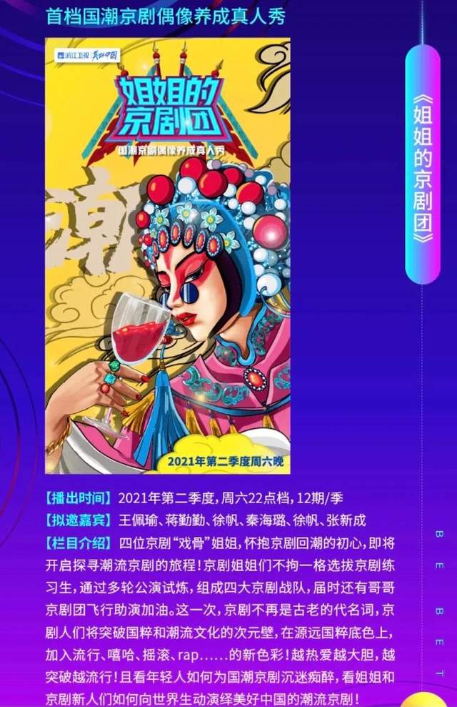 《姐姐的京剧团》以潮流和国粹结合的模式,在京剧里加入流行、嘻哈、摇滚。找来四位京剧戏骨姐姐选拔京剧练习生,最终组成四大京剧战队,还有哥哥京剧团飞行助演。