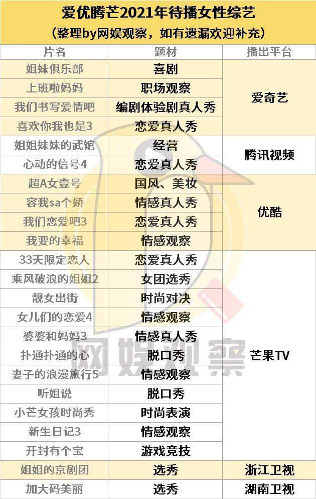 2021年有二十多部女性综艺待播,情感观察类综N代仍然是重头戏,同时“创新”也是女性综艺的关键词。