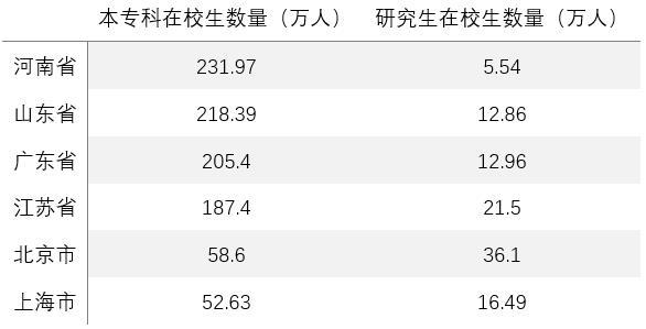 根据广东省2019年统计公报,全省2019年本专科在校生人数为205.4万,但研究生在校生人数仅为12.96万。可供对照的是,北京2019年普通高等学校本专科在校生58.6万人,但在学研究生高达36.1万人。