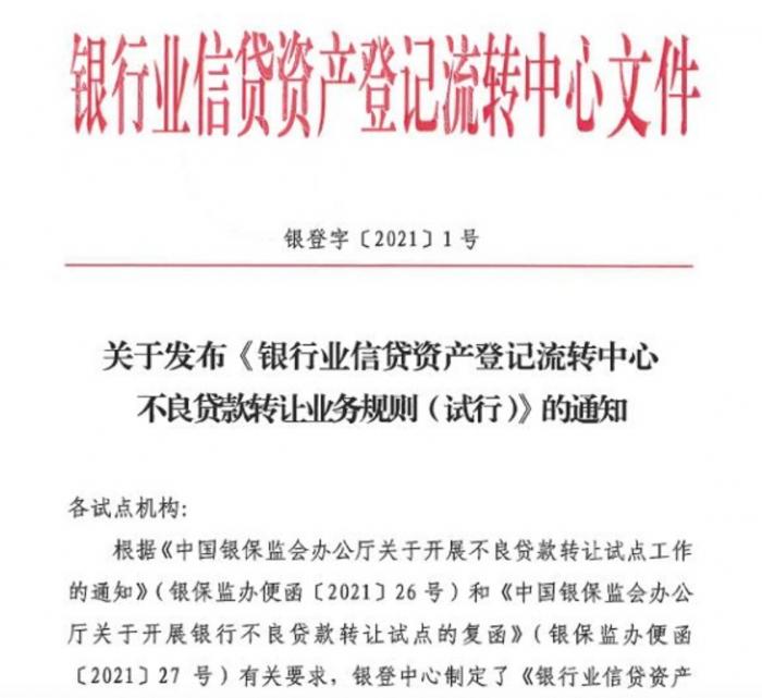 1月14日,21世纪经济报道记者从银行业信贷资产登记流转中心(以下简称“银登中心”)获悉,在银保监会《关于开展不良贷款转让试点工作的通知》下发后,银登中心紧随其后下发了《银行业信贷资产登记流转中心不良贷款转让业务规则(试行)》(以下简称《规则》)《银行业信贷资产登记流转中心不良贷款转让业务信息披露细则(试行)》《银行业信贷资产登记流转中心不良贷款转让业务公开竞价细则(试行)》三份通知。
