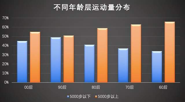 年龄维度上,60后每天平均运动步数最多,90后每天平均运动步数最少。90后每天运动5000步以上的占比51%,80后每天运动5000步以上的占比59%,70后每天运动5000步以上的占比63%,60后每天运动5000步以上的占比66%。