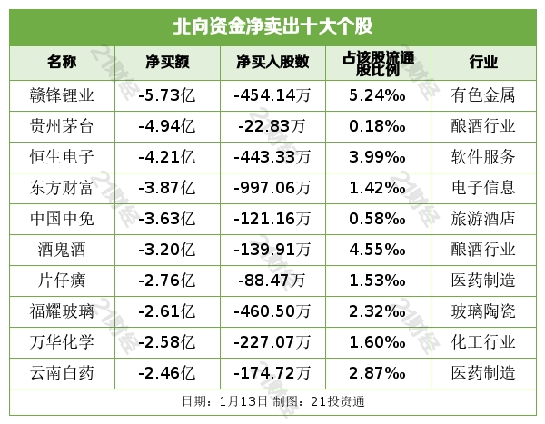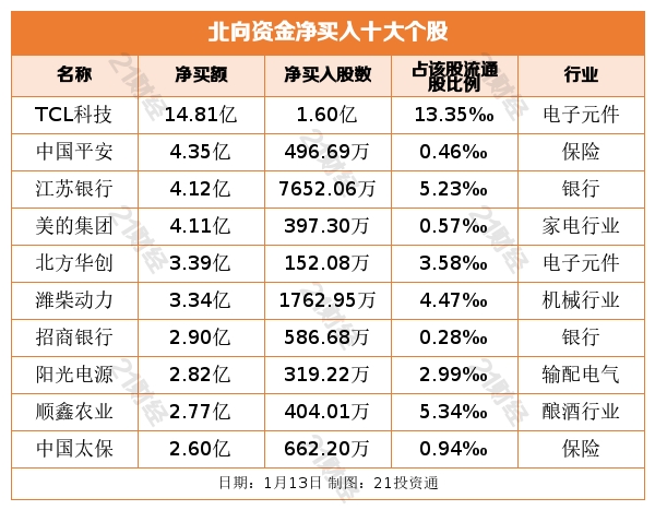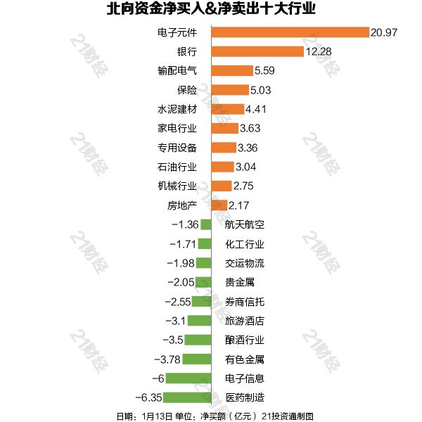 1月13日,北向资金净买入27.12亿元,为连续第六日净买入,其中沪股通净卖出3.58亿元,深股通净买入30.7亿元。增持电子元件,减持医药制造。