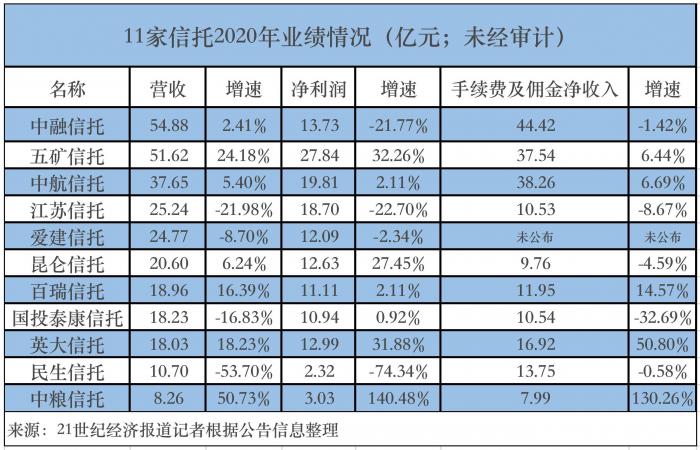 截至2021年1月14日,已有11家信托公司通过A股市场披露了银行间市场未经审计的2020年财务报表。21世纪经济报道记者统计发现,上述信托公司合计实现营收288.94亿元,净利润145.19亿元,分别较上年同期下滑了0.98%和0.79%。