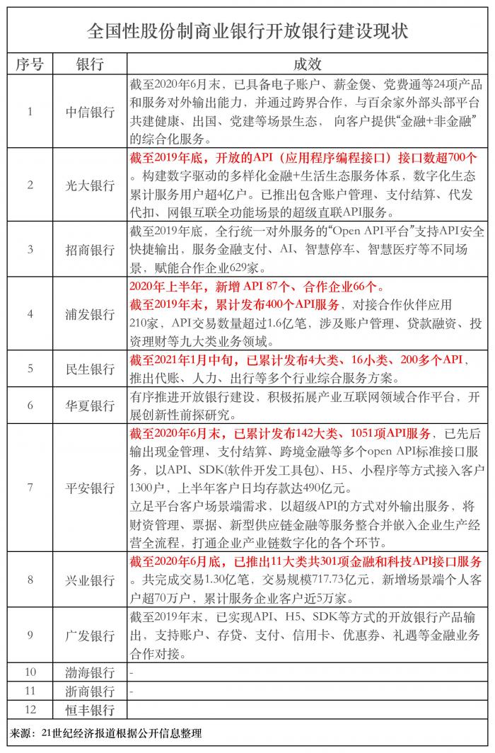 21世纪报道记者粗略梳理12家全国性股份制商业银行关于开放银行建设的进展发现,大部分股份行已取得了阶段性成果,有的股份行对外输出的API服务已高达1051项,除基本的账户开放外,部分股份行开始结合自身优势业务探索输出综合服务方案。