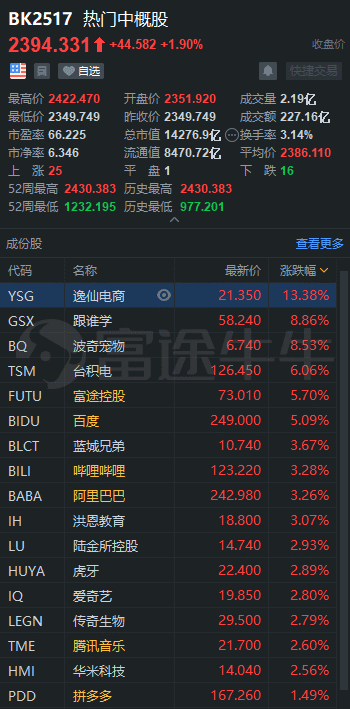 其他中概股方面,富途控股涨5.7%,今年以来已累涨60%;逸仙电商涨13.38%、跟谁学涨8.86%、