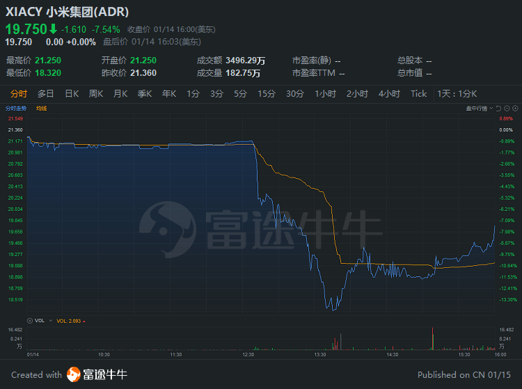受此消息影响,小米集团(ADR)盘中跌幅一度扩大至14%,最终收跌7.54%。
